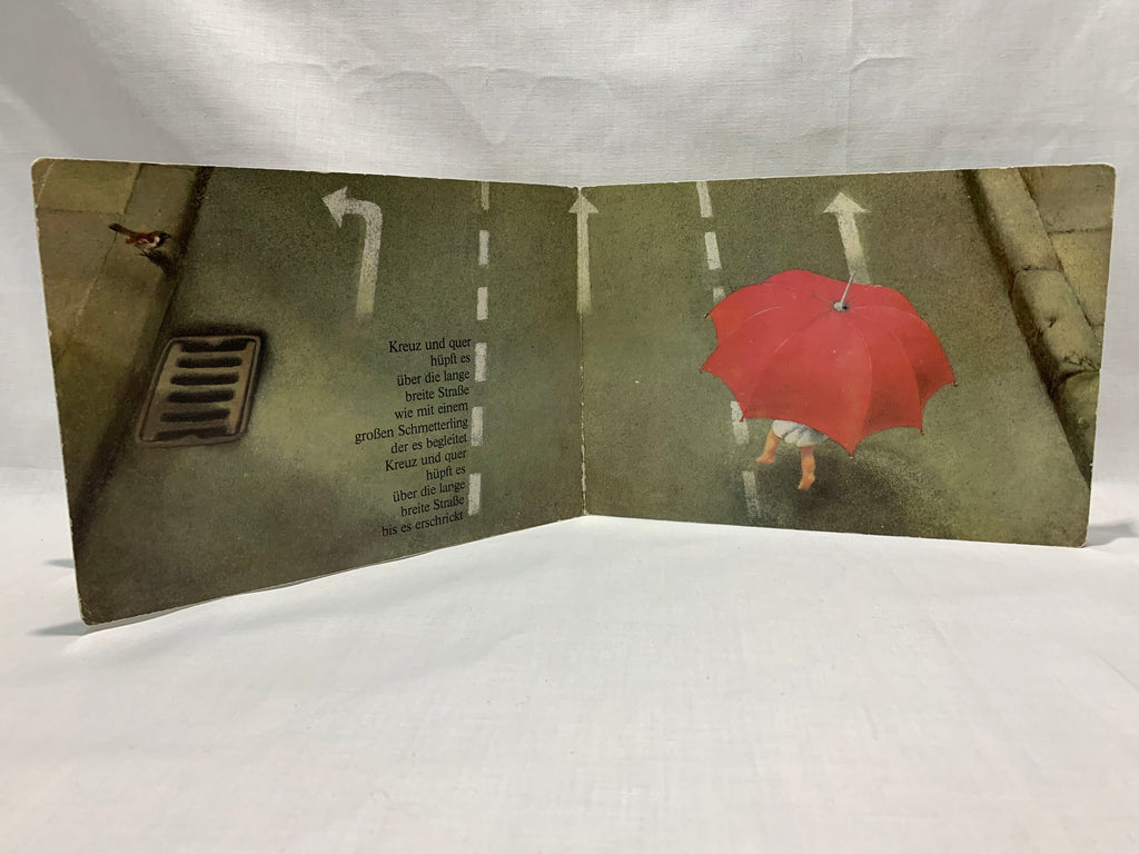 Saksakeelne raamat punase vihmavarjuga üksi uitavast tüdrukust. Soovitame vanusele 3+.