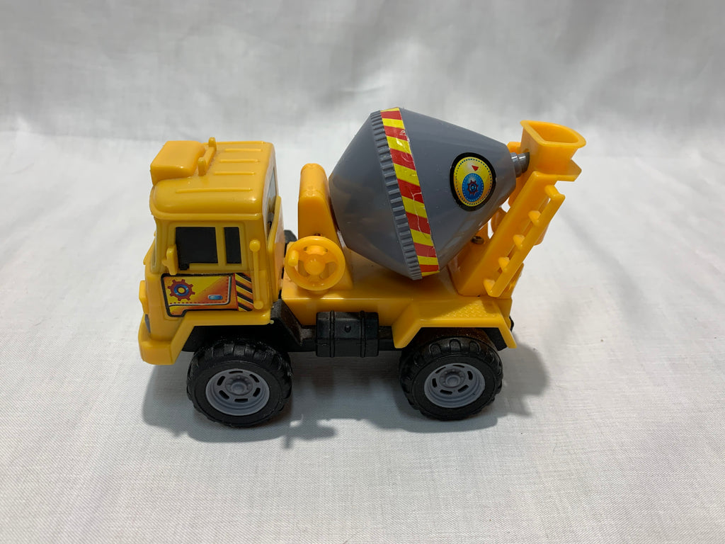Kollane seguauto pöörleva trumliga. Trumli saab pöörlema panna ka rõngast vändates. Sõidab inertsiga.