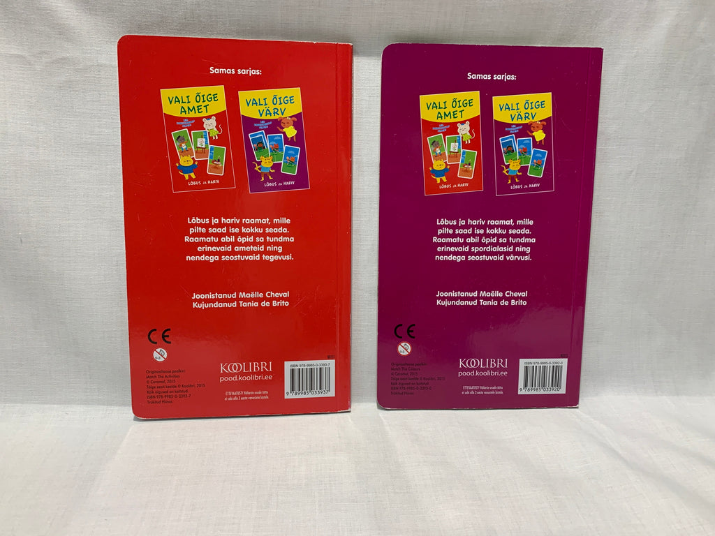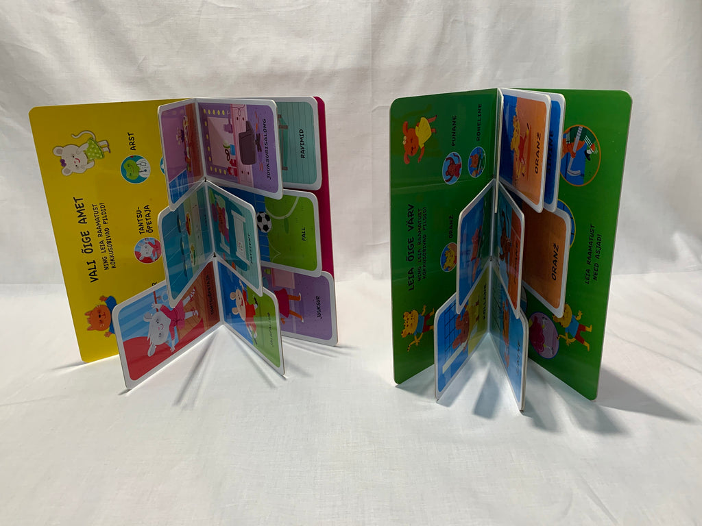 "Vali õige värv" on sporditeemaliste piltidega raamat, mis tuleb ise kolmest kaardist värve sobitades kokku otsida. "Vali õige amet" annab kaartide sobitamise tulemuseks ametit tutvustava pildi. Kolm ühe lehekülje pilti on ajalises järgnevuses. Raamatud õpetavad võrdlema, analüüsima. Soovitame vanusele 3+.